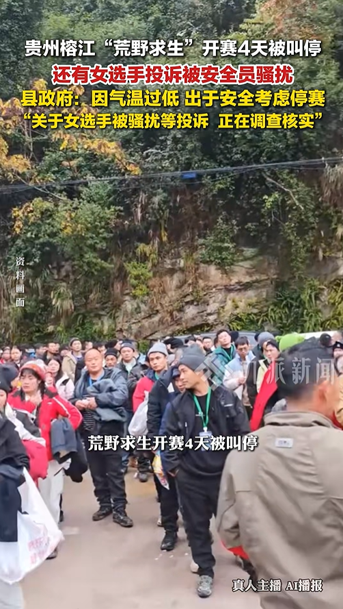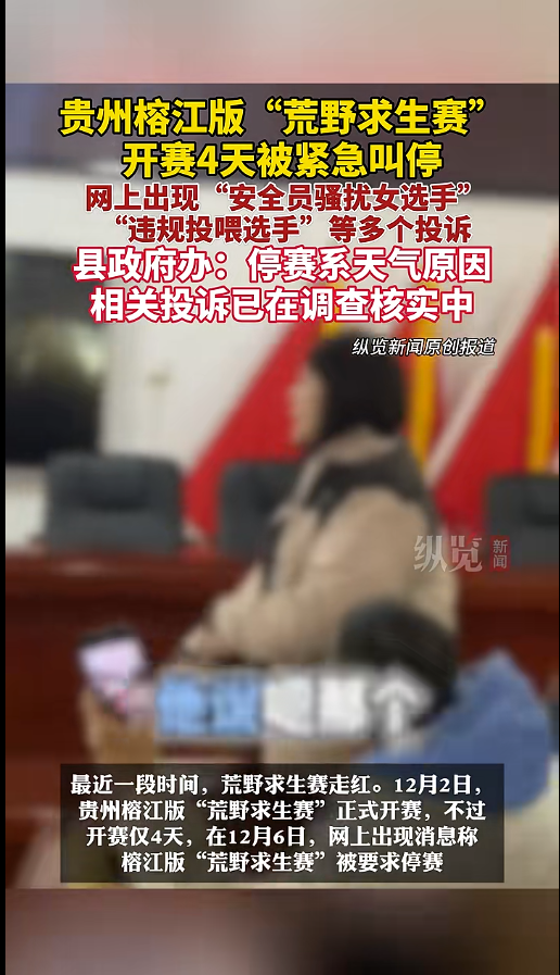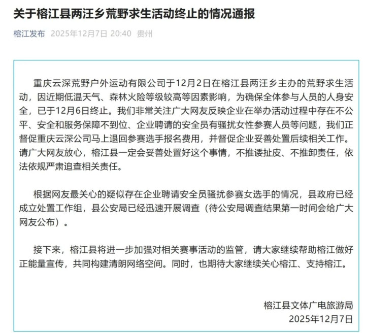 重庆云深荒野户外运动有限公司于12月2日在榕江县两汪乡主办的荒野求生活动,因近期低温天气、森林火险等级较高等因素影响,为确保全体参与人员的人身安全,已于12月6日终止。我们非常关注广大网友反映企业在举办活动过程中存在不公平、安全和服务保障不到位、企业聘请的安全员有骚扰女性参赛人员等问题,我们正督促重庆云深公司马上退回参赛选手报名费用,并督促企业妥善处置后续相关工作。请广大网友放心,榕江县一定会妥善处置好这个事情,不推诿扯皮、不推卸责任,依法依规严肃追查相关责任。
